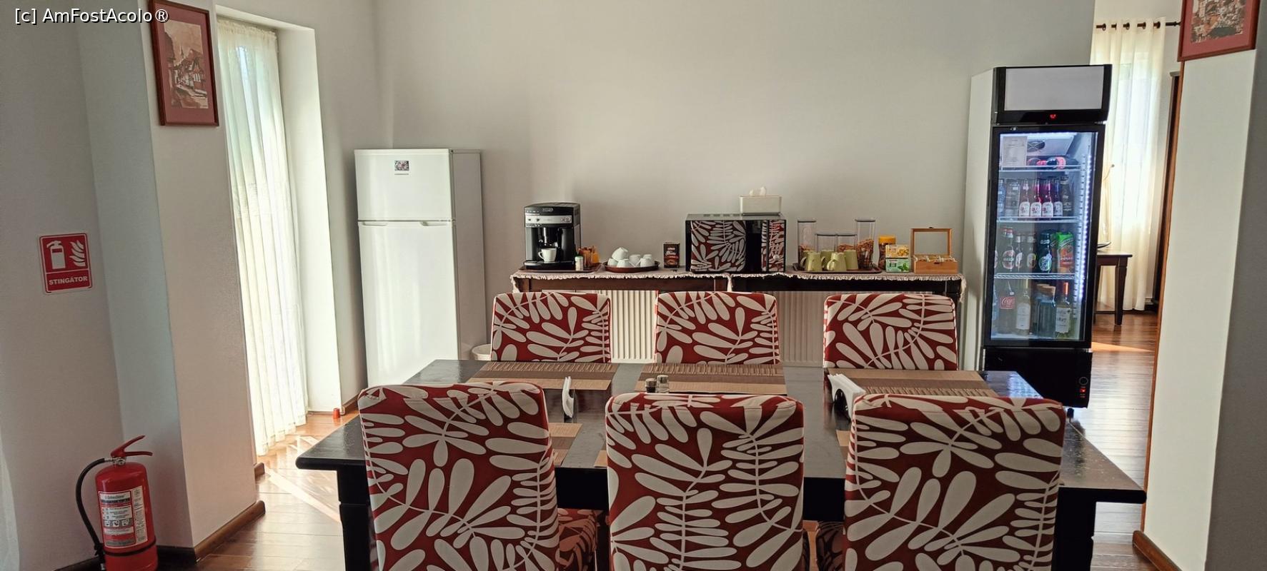 [P05] Sala de mese - în fundal vitrina frigorifică cu lichide de vânzare, combina frigorifică destinată clienților, espresorul de cafea și cuptorul cu microunde puse gratis la dispoziția oaspeților.