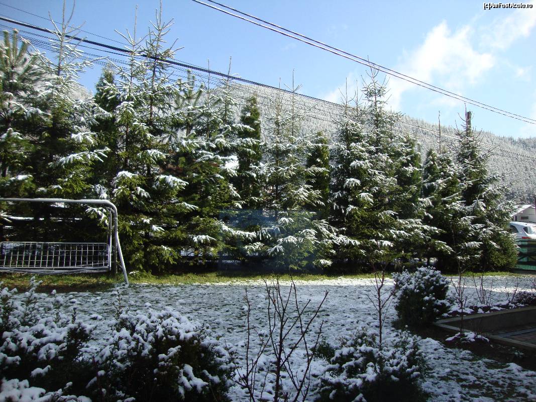 [P22] Fotografie făcută din livingul pensiunii, a doua zi de dimineață. Natura s-a îmbrăcat într-o mantie argintie.
