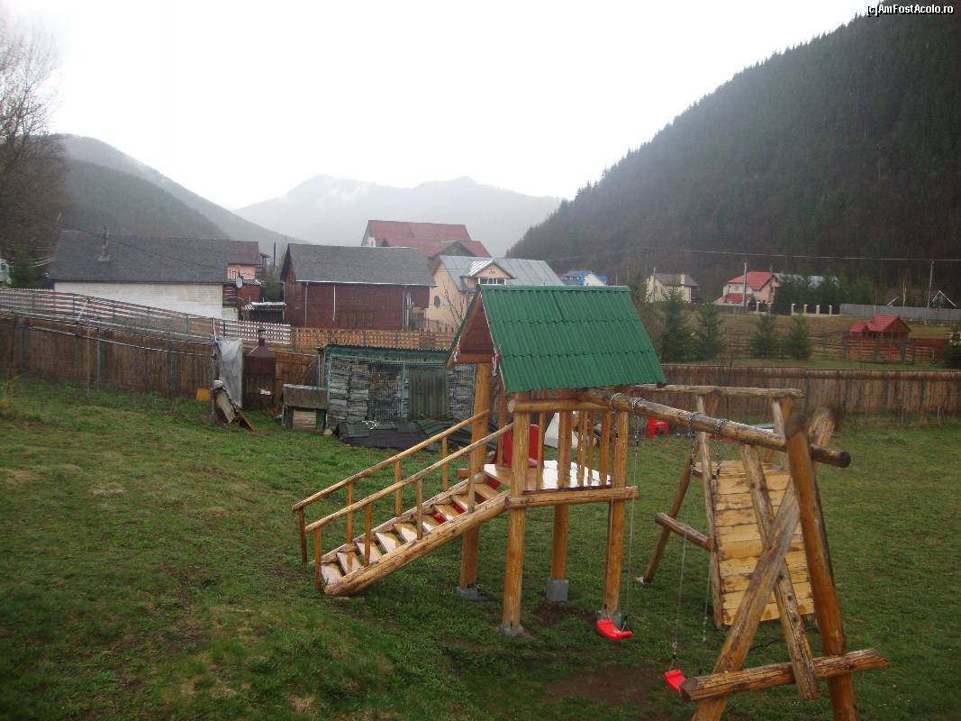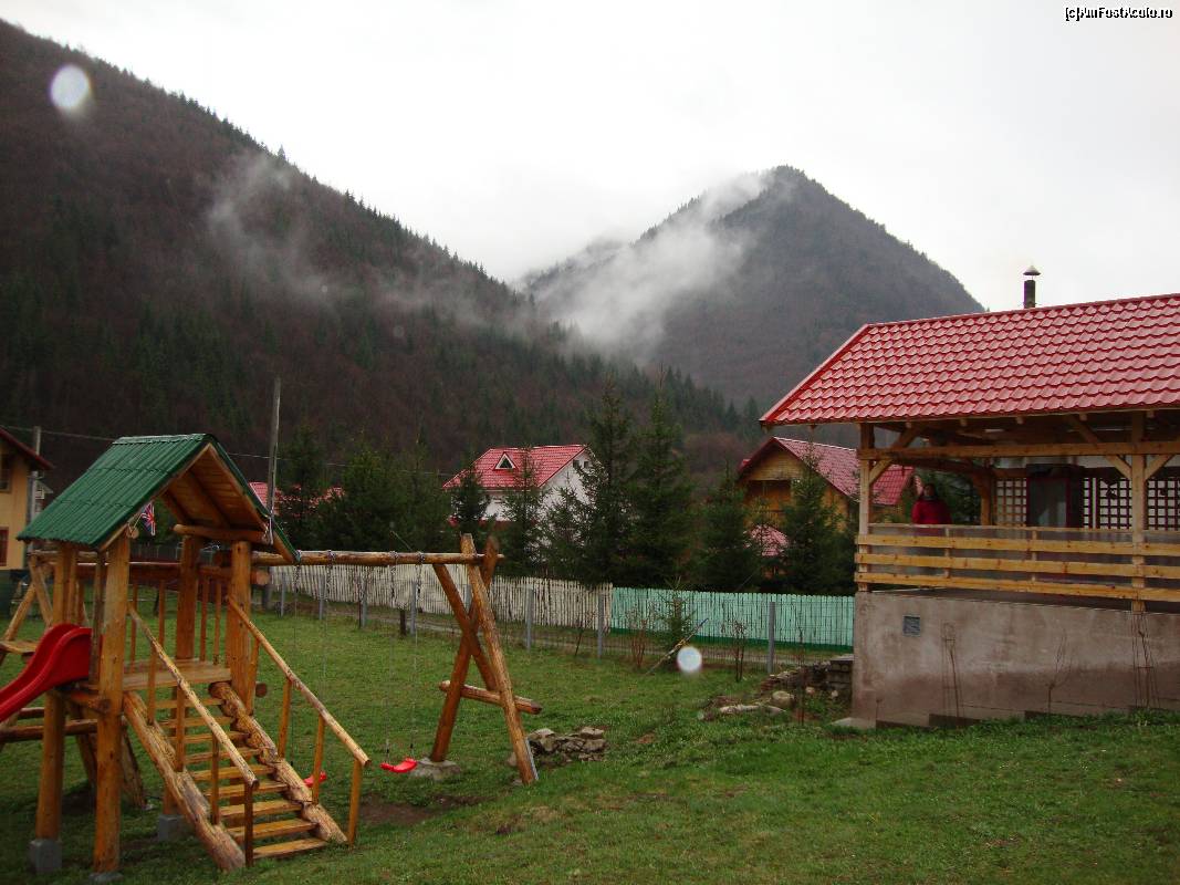 [P27] Foișorul pensiunii și locul de joacă sunt destul de apropiate. În spate se pare că Munții Vrancei au luat foc.