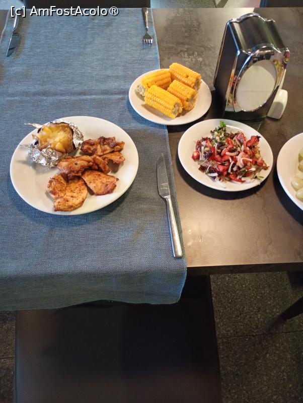 [P24] Masa de seară cu șnițel de pui și chiftele din carne de curcan alături de cartofi natur și mix de salată. La desert porumb fiert.