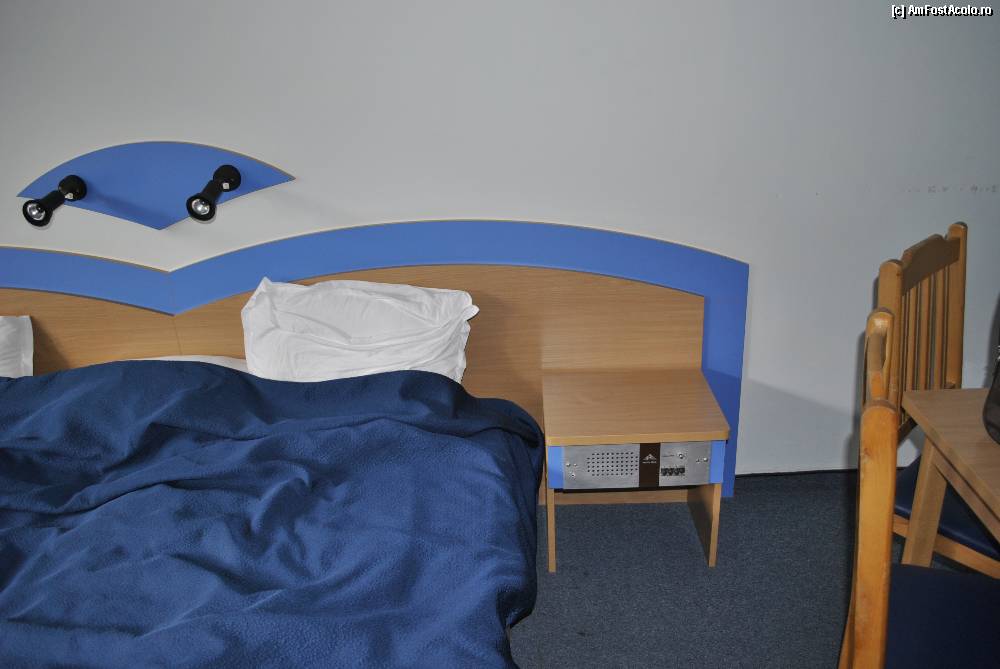 [P08] Poza din camera. Se vede patul dublu iar in noptiera ciudatul aparat de radio... (cred ca e de pe vremea bunicilor)
