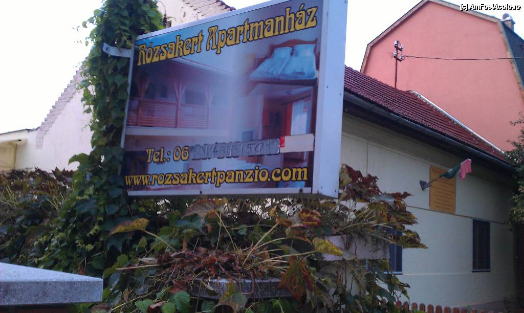 [P03] Pancarta cu adresa pensiunii Rozsakert Apartmanhaz din Hajduszoboszlo, Ungaria.