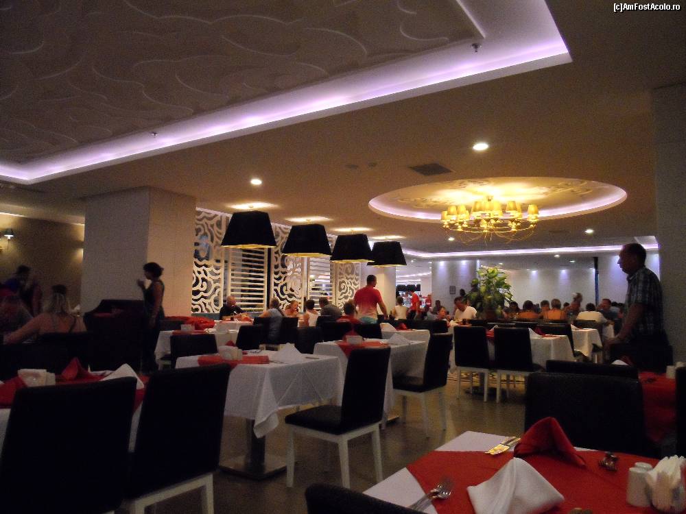 [P09] Sala de mese. Avea trei sectiuni, fiecare cu alta culoare a fetelor de masa (rosu, roz si negru. Asa aratau mesele, indiferent ca veneai la inceput sau catre sfarsitul programului de masa.