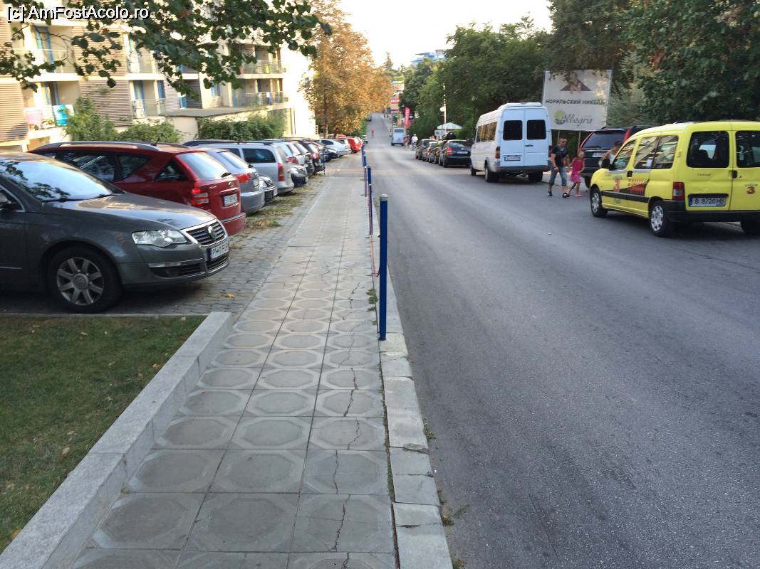 [P35] Parcarea din fata hotelului. In prima zi am primit loc pe partea dreapta (unde e duba alba), iar a doua zi a plecat cineva si am mutat-o pe stanga in 'parcarea oficiala' (pe trotuar, protejata de un lant) (dadusem 10 leva bacsis tipului care se ocupa cu chestii de genul)