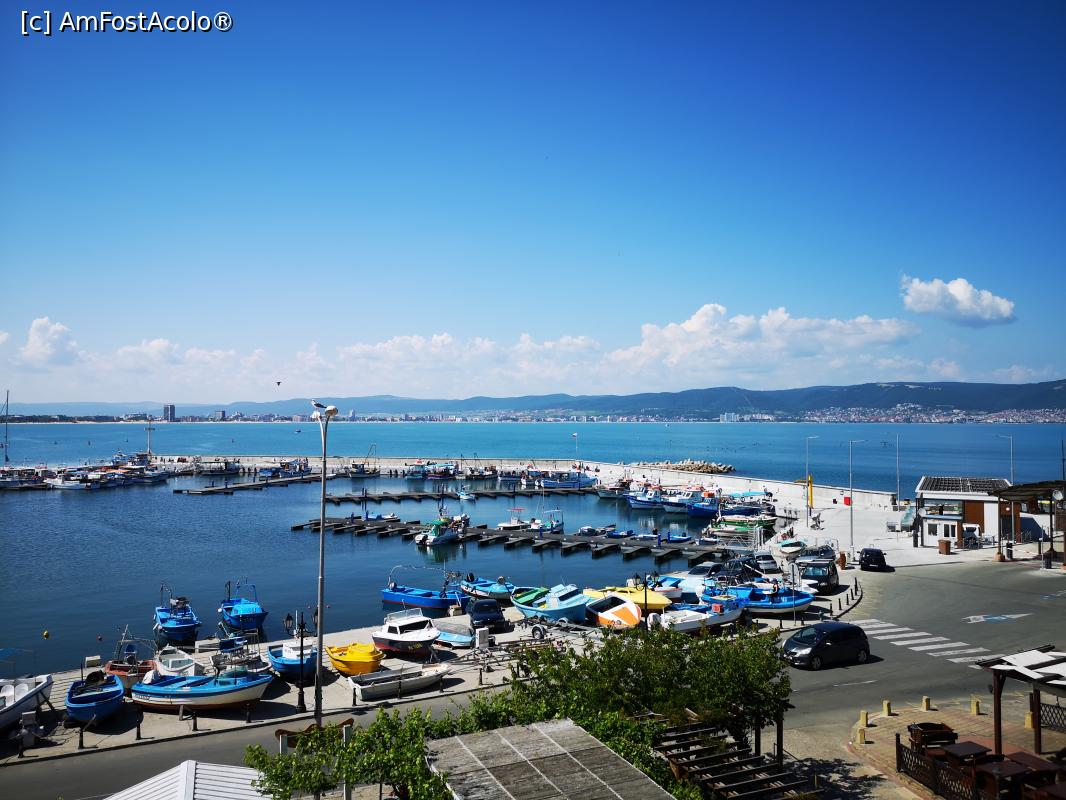 [P01] Priveliște de la balcon; portul și, spre dreapta, intrarea în parcarea cu plată