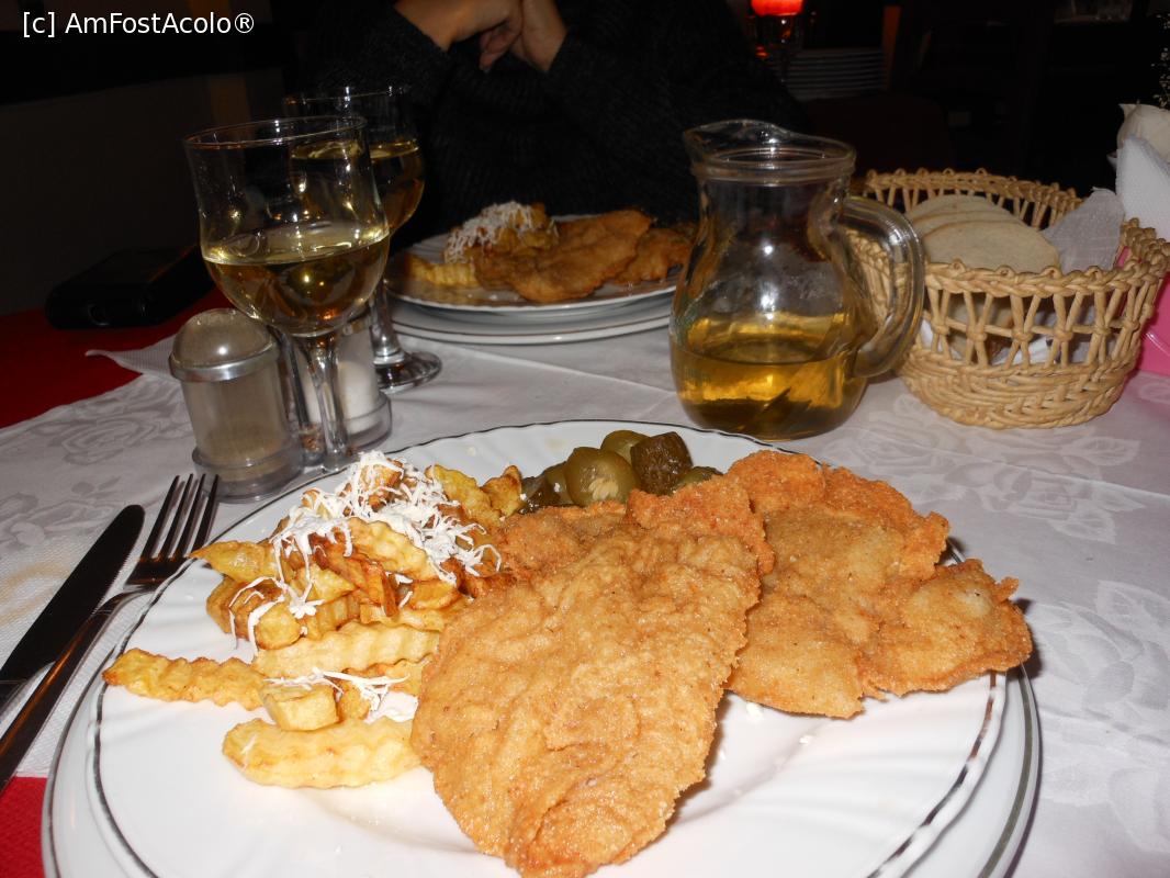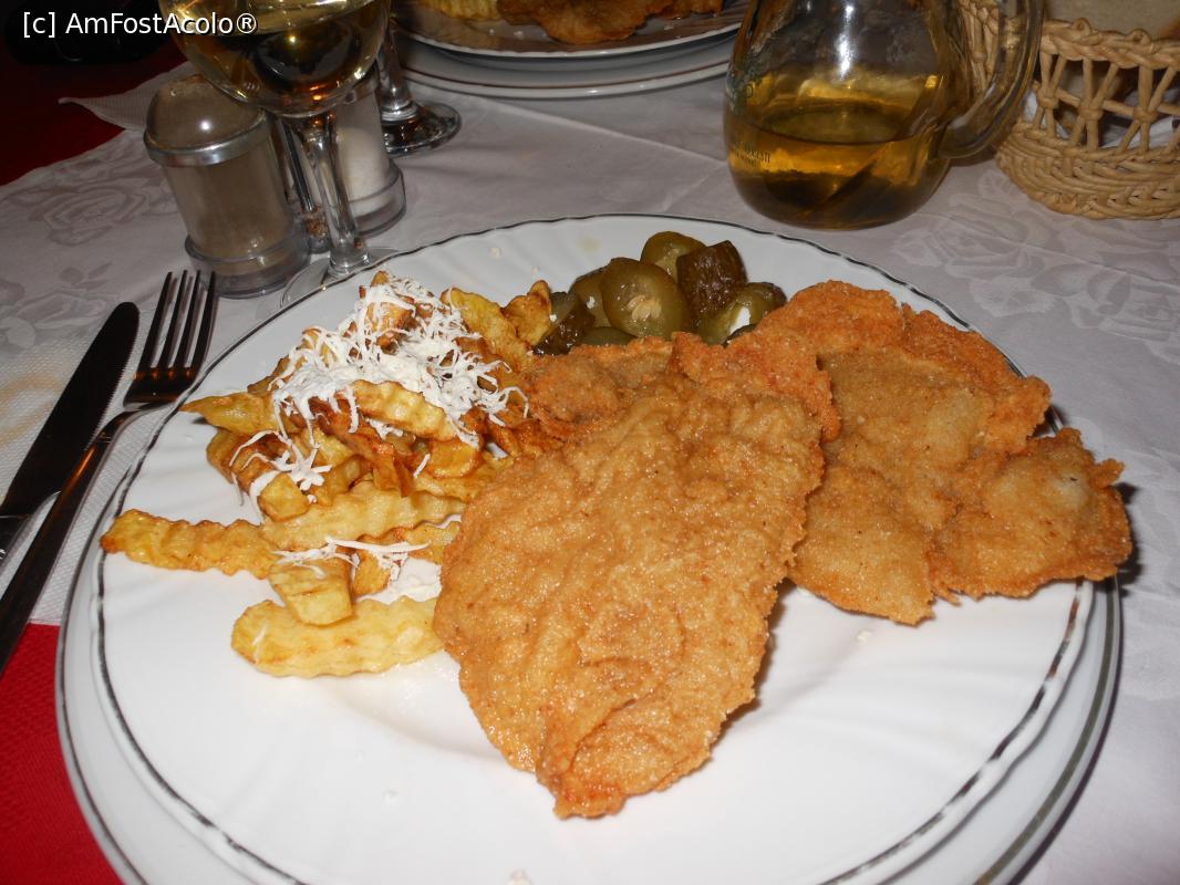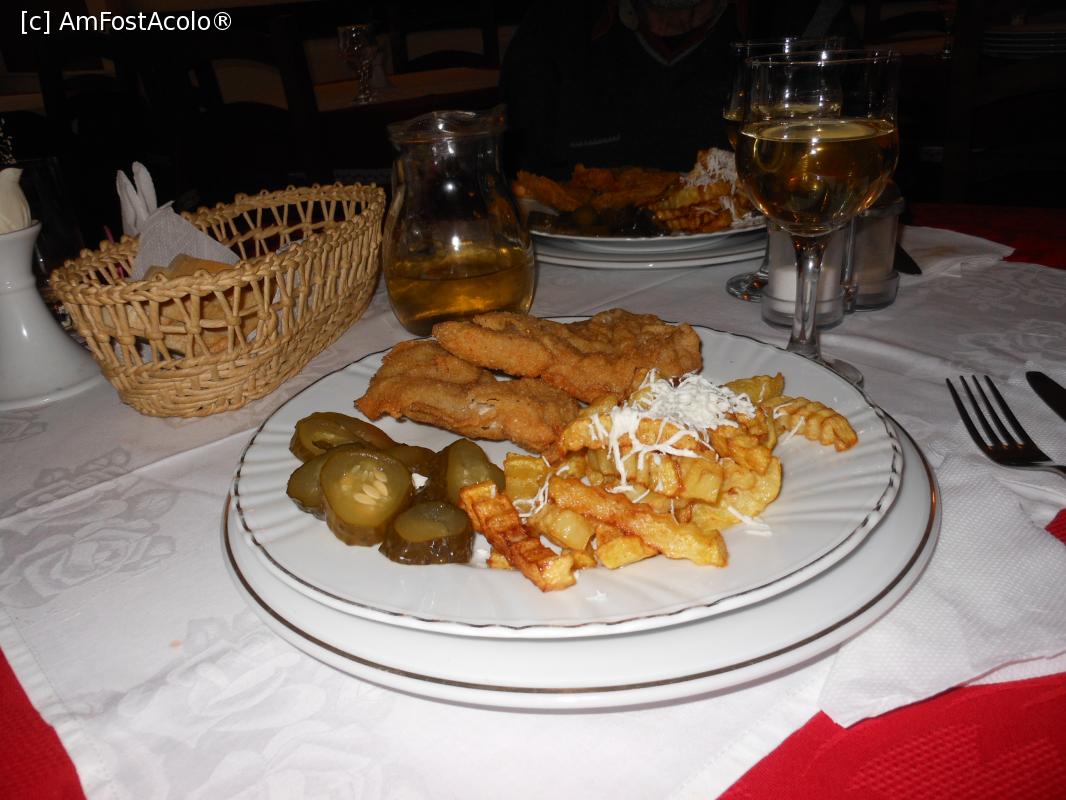 [P16] Restaurant Crilis - Șnițel de porc, cartofi cu brânză rasă și castraveciori murați.