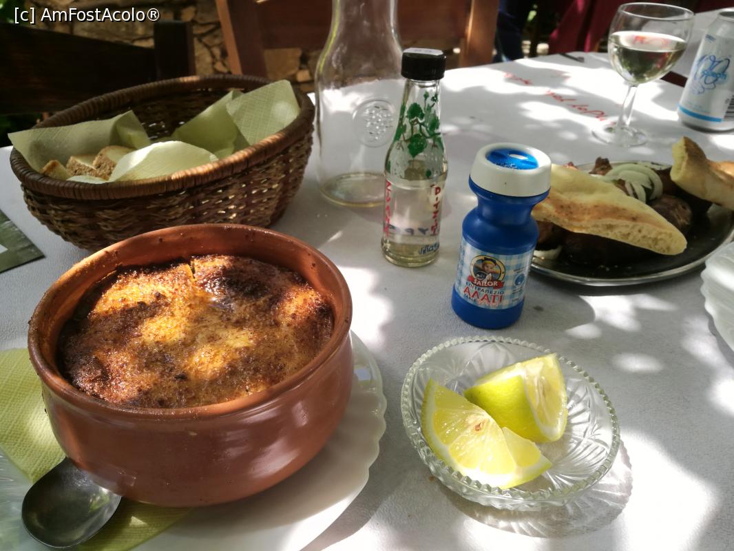 [P24] Taverna Filippos Finikas musacaua și, în plan îndepărtat, fripturica lui Tati (scuze, n-am o poză mai detaliată, cred că ne-am grăbit, de foame)