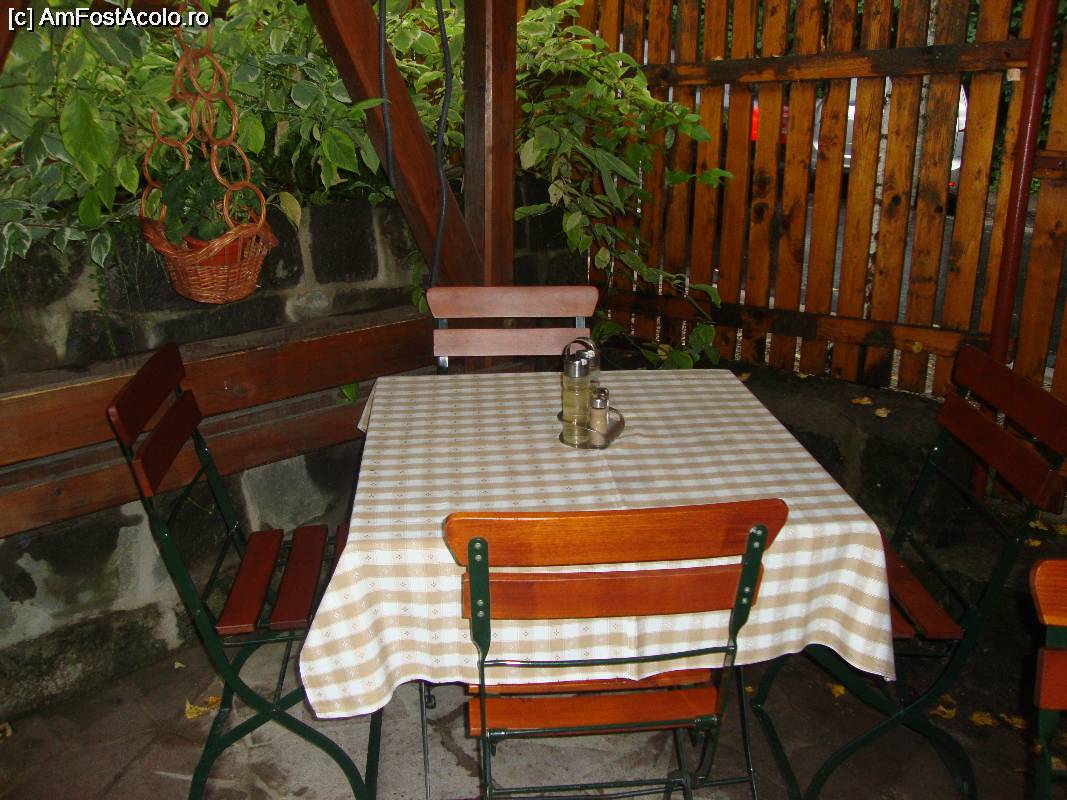 [P08] O masă liberă pe terasa exterioară a hanului; chiar dacă afară a plouat, noi am fost îmbrăcați bine și nu ne-a fost frig aici.