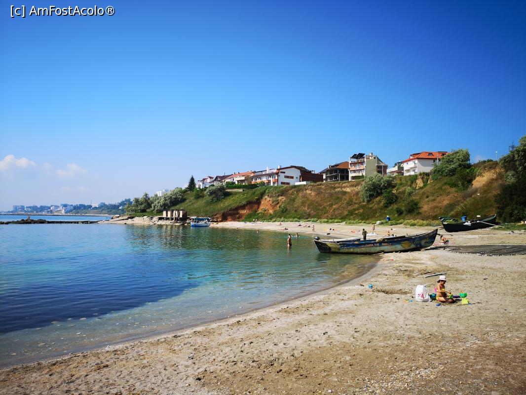 [P12] Plaja Golful Pescarilor, văzută de pe șezlong (și Vila Andreea, gazda noastră minunată, prima clădire din stânga, pe prima linie)