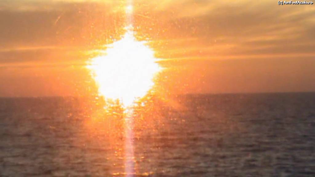 [P76] 75. Și un alt apus de soare. Din nefericire, camera focalizează pe geamul hubloului. Dar arată bine și așa.