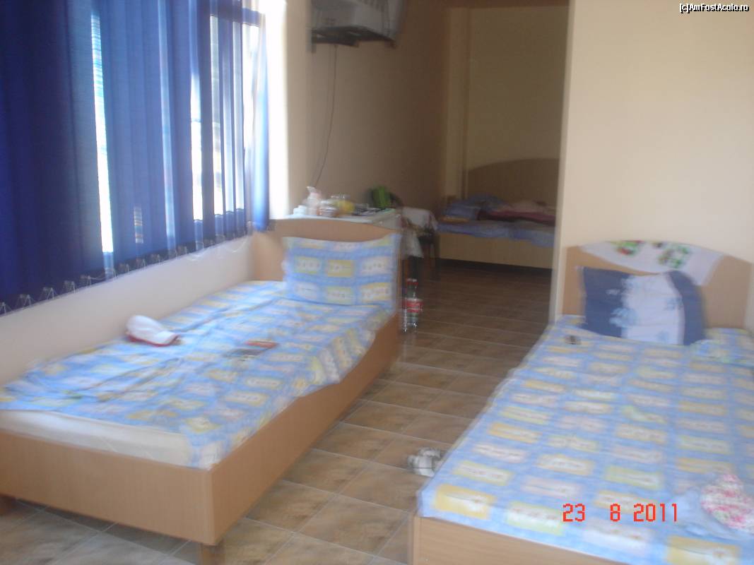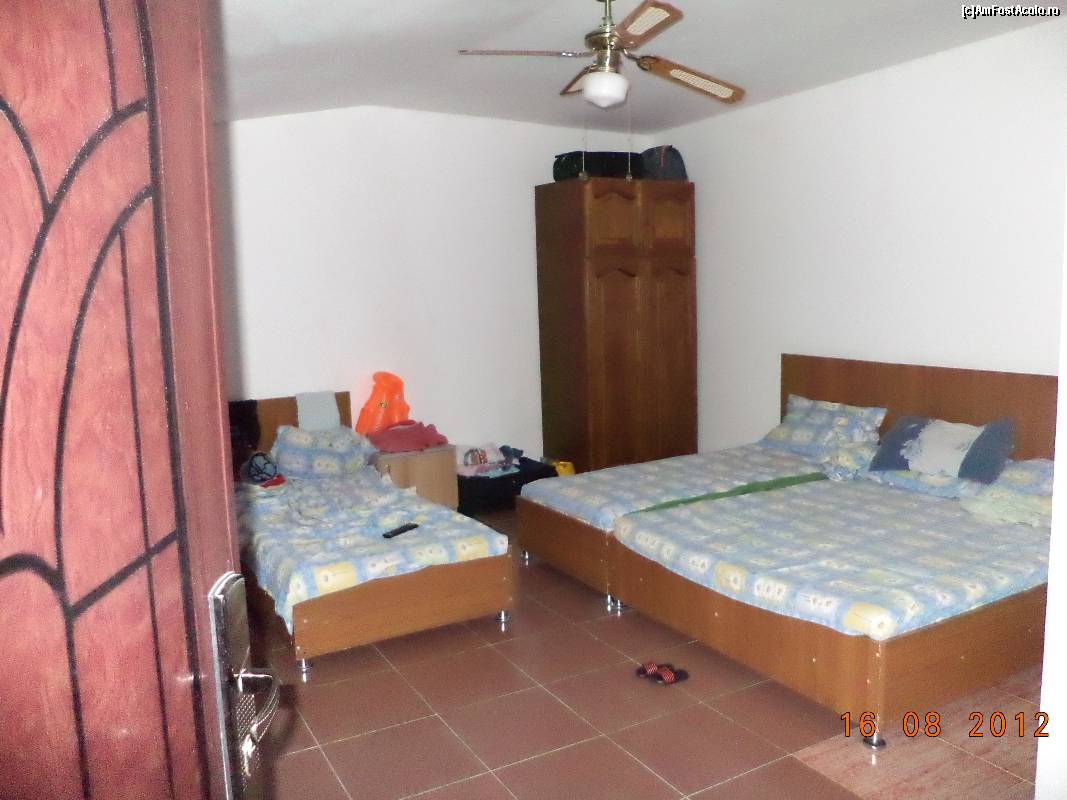 [P01] Vedere de la intrare spre camera. Se vede patul dublu. Mai sunt 2 paturi de o persoana in camera.